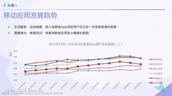 移动应用发展趋势,生活服务、运动健康、丽人母婴类App活跃用户在过去一年呈明显增长趋势;图像美化、教育培训、电商导购类应用呈小幅增长趋势。