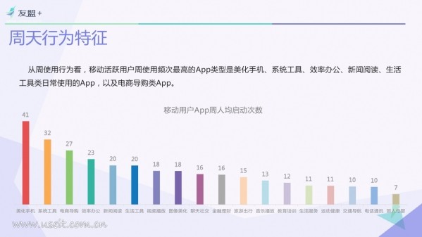 从周使用行为看,移动活跃用户周使用频次最高的App类型是美化手机、系统工具、效率办公、新闻阅读、生活工具类日常使用的App,以及电商导购类App。