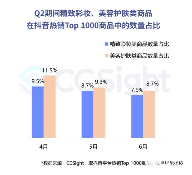 抖音热销商品中,精致彩妆类商品数量占比从4月的9.5%逐渐降至6月的7.9%,美容护肤类商品数量占比从4月的11.5%逐渐降低至6月的8.7%。