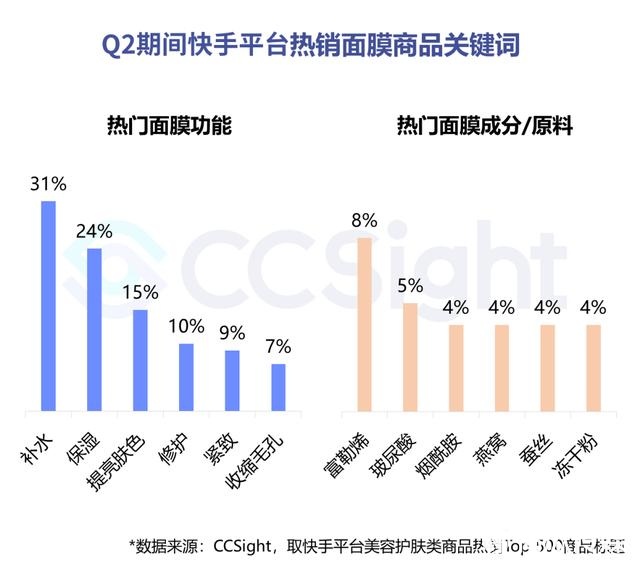 Q2期间,面膜、洁面、精华、化妆水单品在快手热销美容护肤类商品中数量占比较高。