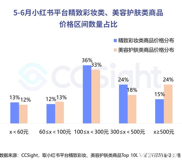 小红书平台有70%的精致彩妆类商品价格处于100-500元区间,美容护肤类商品的主要价格在100-300元区间,其次是价格≥500元。