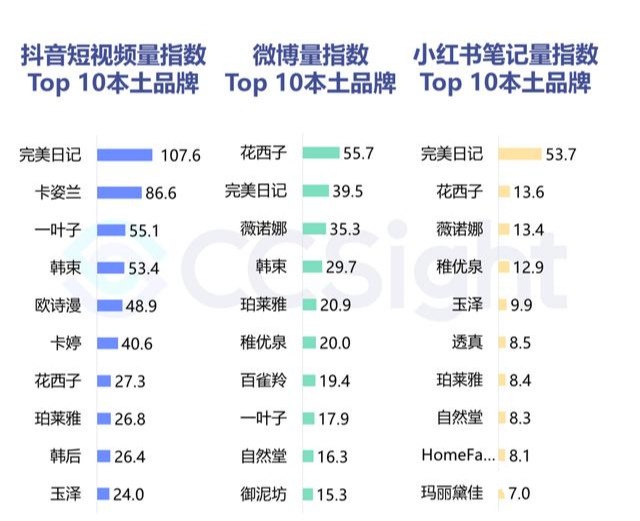 本土品牌排行榜中,完美日记、卡姿兰、一叶子的抖音短视频量跻身前列。
