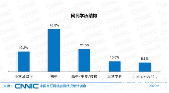 根据第46次《中国互联网发展状况统计报告》显示,截止2022年6月,受过大学专科及以上教育的网民群体仅占18.8%,初中及以下学历的网民群体占比接近60%。网民整体结构和知乎“精英化”的社区生态有很大冲突,这就意味着,知乎用户结构几乎是不可避免地越来越接近网民整体构成,而内容的质量和调性也会无法避免地“变味”。