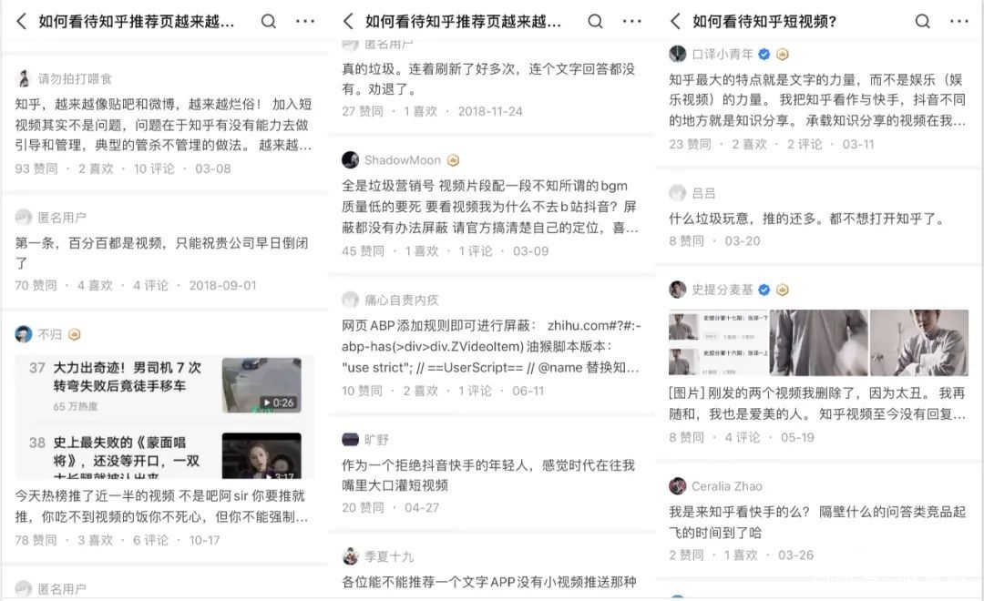 知乎作为一个以文字为基石的内容平台,用户也习惯在知乎上看文字。但知乎追赶短视频末班车的动作,不禁让人疑惑,知乎为何要放弃自己熟悉的文字战场,去别人擅长的视频领域搏斗呢?(知乎用户评论:我为什么要来知乎看快手?)在知乎上搜索知乎视频相关的话题,用户的提问和留言基本上都是对知乎短视频的反对。