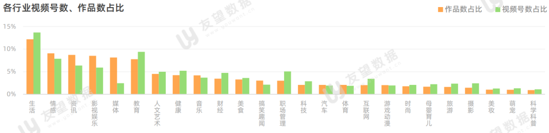 在友望数据统计中,情感行业总点赞、总评论占比最高,分别是 20.68%、18.08% 。与情感内容一样能调动用户情绪的音乐位居第二,总点赞占比 9.54%,生活、影视娱乐紧随其后,在视频号平台,泛娱乐内容更能触达用户,互动性也会更强。