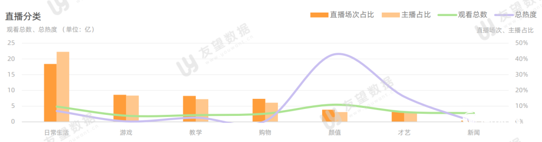颜值才艺类主播多集中在生活、音乐等行业,因此观看总数、总热度相对较高。