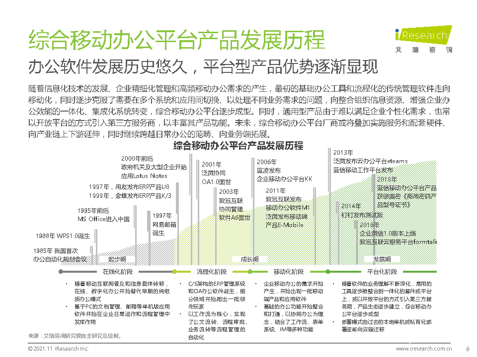 综合移动办公平台是整合企业组织管理体系,提供一体化、多样化的办公方案,具备提升效率和改善体验的核心价值。在基础设施成熟、数字原生居民崛起、企业数字化转型和疫情的驱动下,其重要性愈发凸显。本报告以综合移动办公平台为研究对象,着重分析其核心价值、驱动因素、发展历程与市场供需,并在典型案例研究的基础上探讨未来的趋势。