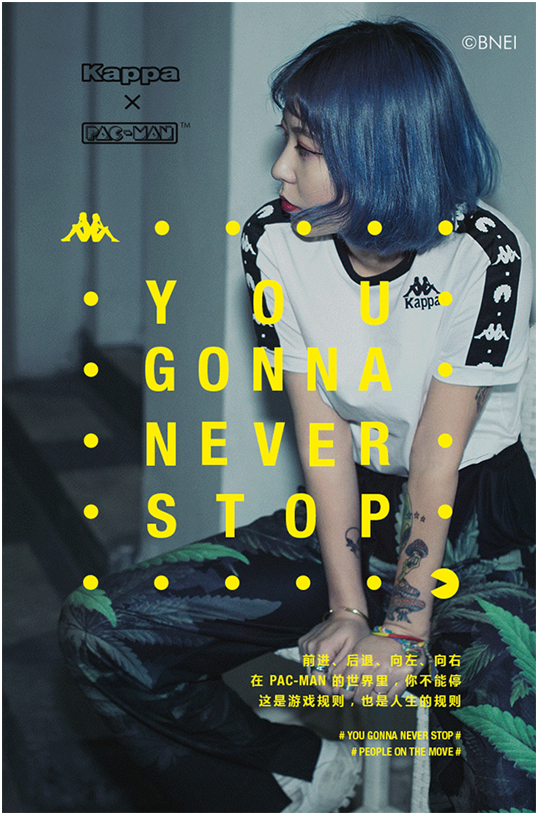 此次Kappa与Pac-man的合作不但限于设计与形象的简单结合,而是从品牌精神上进行挖掘关联——前进、后腿、向左、向右……#YOU GONNA NEVER STOP#的游戏规则与Kappa #PEOPLE ON THE MOVE#的品牌精神契合,从而以将运动与游戏有效结合。同时邀请潮流各界KOL以故事的形式进行个性演绎,并联合专业游戏领域媒体作为推广代表,为跨界产品进行深度背书。最终让双方粉丝高呼过瘾,在新媒体掀起小高潮。