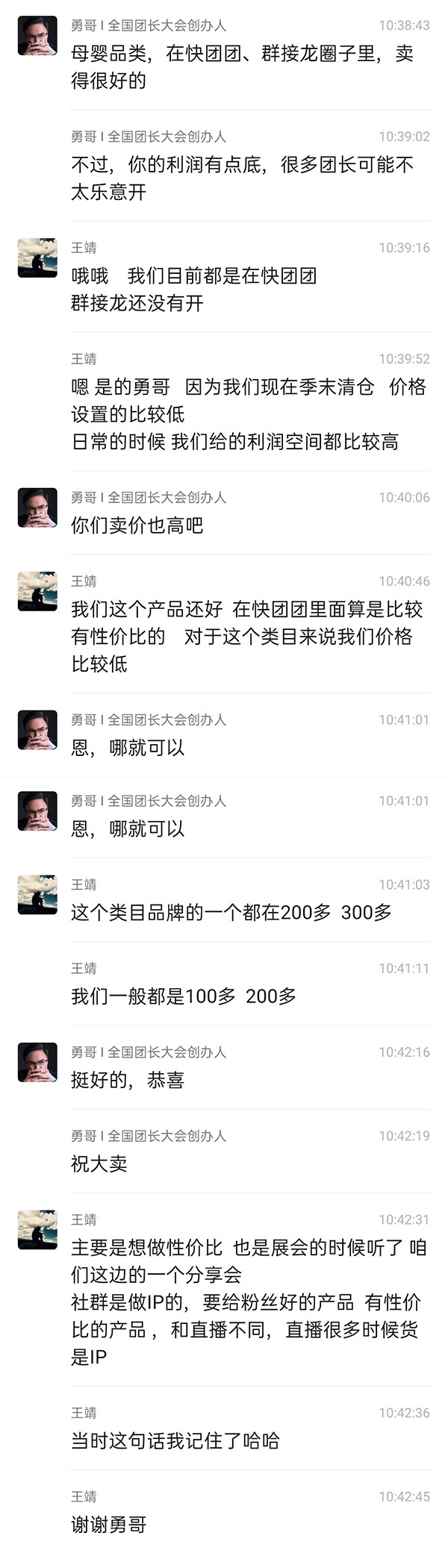一个做母婴小众产品的客户,在参加完9月份,沸点在杭州举办的第2届全国团长大会,跟勇哥反馈:感谢勇哥!感谢沸点!我们是一个母婴类目的商家,产品为婴儿睡袋,属于社群母婴的小众产品。9月份参加了咱们沸点的展会,结识了很多沈群大咖,也学习到了很多。展会合作上的快团大咖,这个月开了一个团,目前卖了2000多单,转化9%多。没想到我们这种小众类目也能有这样的销量。