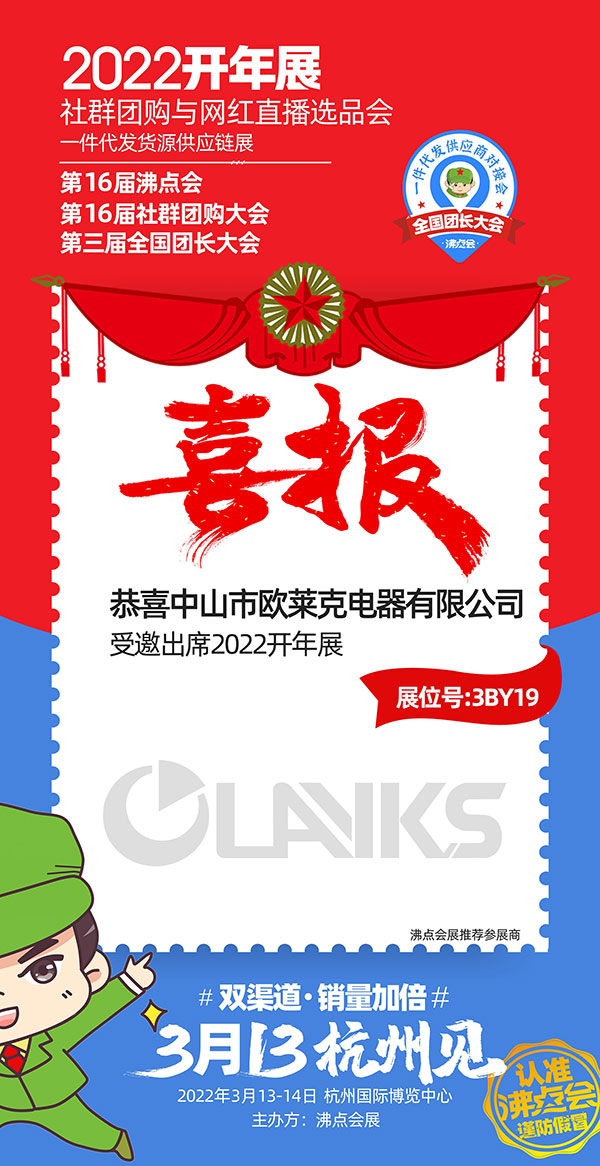 由沸点天下创办、沸点会展主办的2022杭州全国团长大会,一件代发货源对接会定于2022年3月13-14日举办,大会分为3大馆,6大展区。目前正在进行展位招募。届时,家电企业——中山市欧莱克电器有限公司将受邀参展此次活动!