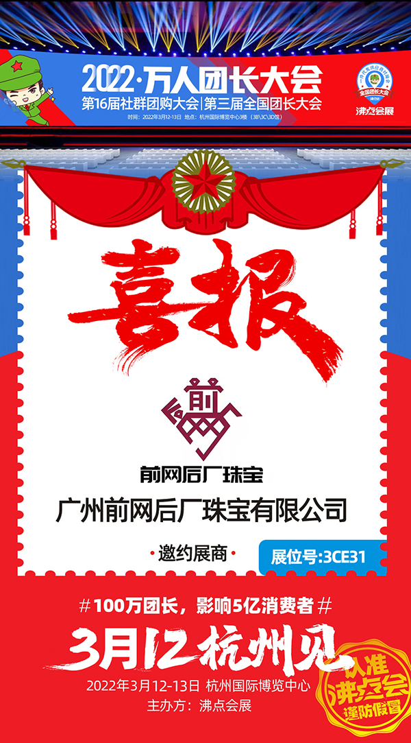 2022杭州团长大会将于2022年3月12-13日在杭州国际博览中心隆重举办,分为二天一夜在杭州国际博览中心举办!大会分为3大馆,6大展区,展位面积30000平米,展商数量800+,新品爆品10000+,渠道方1000+,行业观众10000+。届时,广州前网后厂珠宝有限公司受邀参展!
