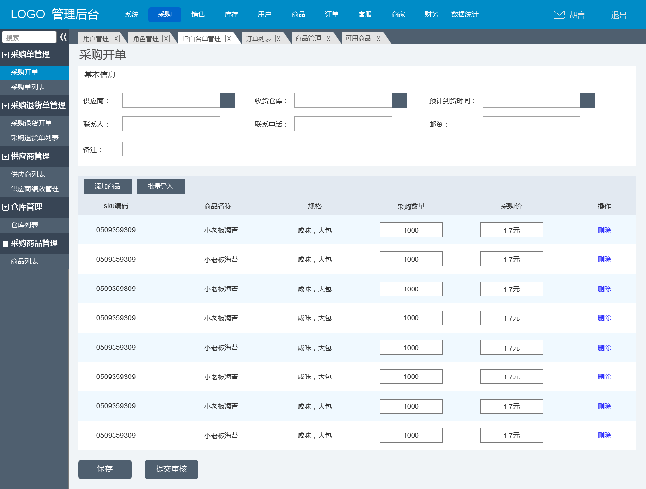 采购开单页面,此页面是采购执行层的开始,主要包孕采购单基本信息和商品信息。供应商,获取供应商列表的数据,选择此次采购从哪个供应商那里采货;收货仓库,获取仓库列表的数据,选择此次采购要入的仓库;商品信息,主要维护此次采购的商品数量和采购价,商品以SKU为单位进行采购。