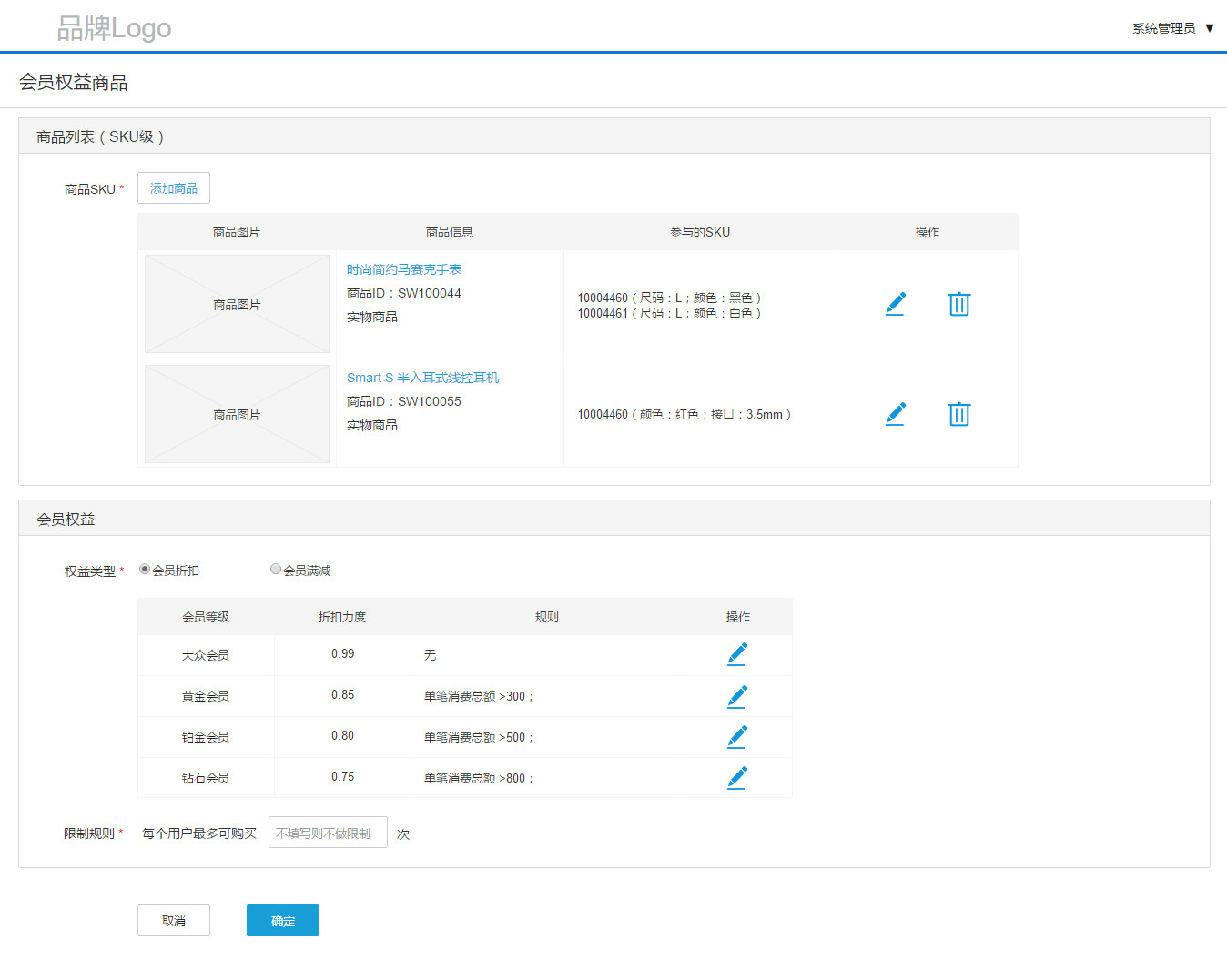 其优势是:直不雅观,干净!商品SKU、会员等级权益独立办理,其组合关联后对象权益SKU也是独立办理。属于松耦合办理,各元素组件都是模块办理,比较灵活,比较直不雅观。