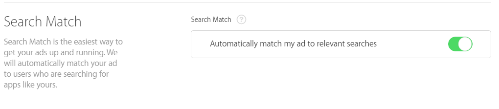 苹果的search match匹配是一个非常好的功能,,它是按照App的元数据自动匹配搜索词。优点是广告主可以极其简单的上线一个广告,哪怕一个关键词都不设置也可以进行投放,缺点是search match有时候匹配来的量有些离谱,导致造成广告费用的浪费。 当然这个功能是必然要打开的,可以单独设置一个广告组,让苹果来帮你拓词,需要注意的是,别把这个组扔那不管了,需要按期监控这个组里来的搜索词,将极不靠谱的词仍到否定词里。