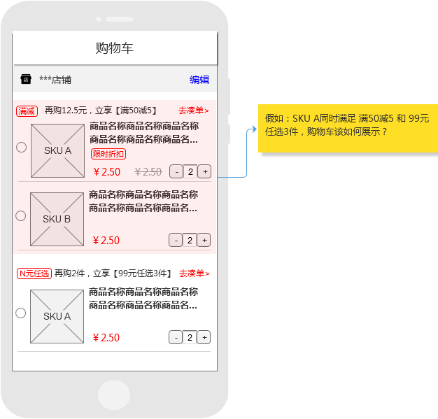 因为同一个SKU 在同一段时间内具备了两个价格(一个秒杀价格,一个折扣价格),这时候系统该选择哪个价格作为这个SKU的价格呢?如果一个用户恰好添加了这个SKU 到购物车,那么购物车的促销怎么展示?画风是这样的,大家感受一下: