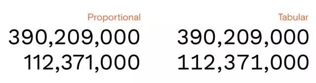 设计成比例数字的目的用于连结颜色协调——即字体的大小和间距要一致。另一方面,表列数字的尺寸相对独立,所以他们可以纵向对齐。虽然在只有一到两行的情况下,这种区别并不明显,但在对于大型表格来说,使用表列数字会浏览起来更便利且不易出错。