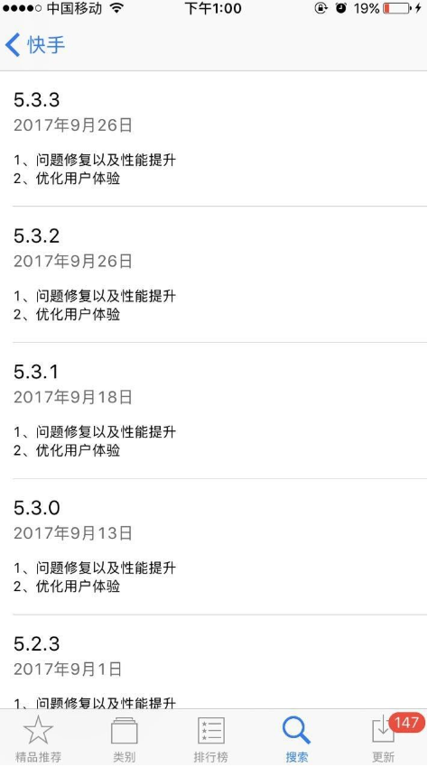 别的,我发现快手的产品表示层上几乎没有任何改动,架构上始终只有三个Tab“关注”、“发现”和“同城”。其在App Store上的版本记录里,每次都只有两点。