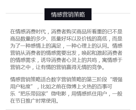 1、情感营销策略:情感营销就是把消费者个人情感差异和需求作为企业品牌营销战略的核心,通过借助情感包装、情感促销、情感广告、情感口碑、情感设计等策略来实现企业的经营目标。