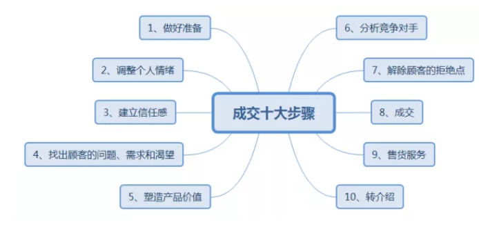 今天我们先来捋顺一下完美销售的十大步骤,如图所示: